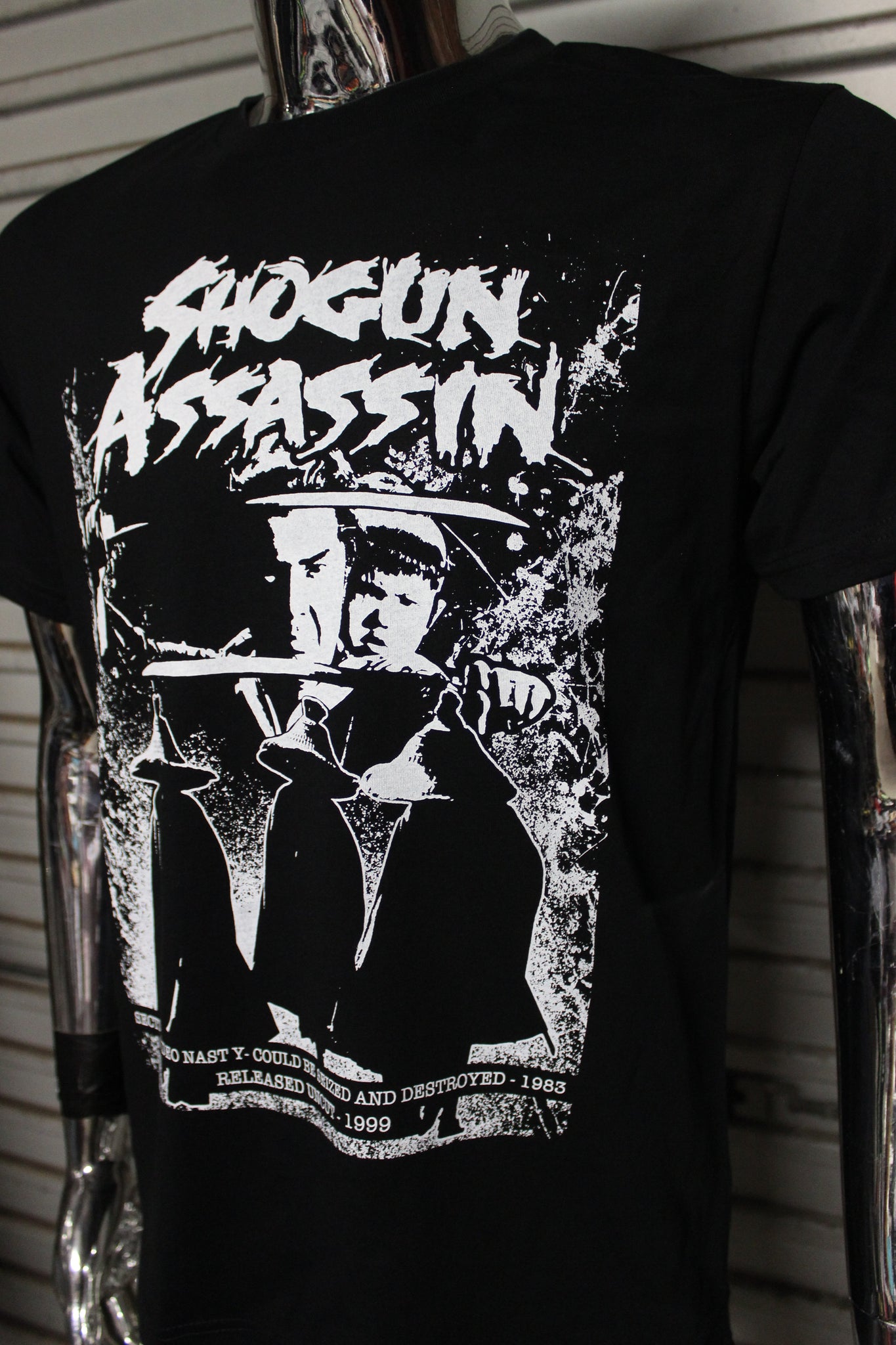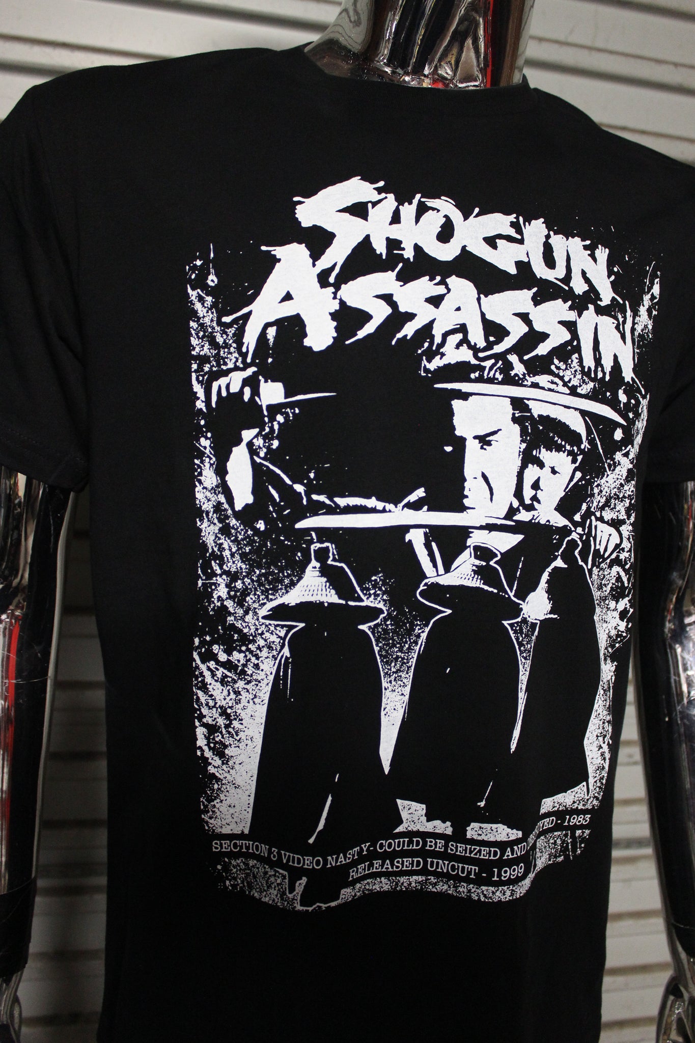 Done in the style of iconic cut and paste photocopied DIY punk flyers this t-shirt print has all the geek info on the video nasty history of Shogun Assassin - when it was banned in the UK and it's journey back onto home media.